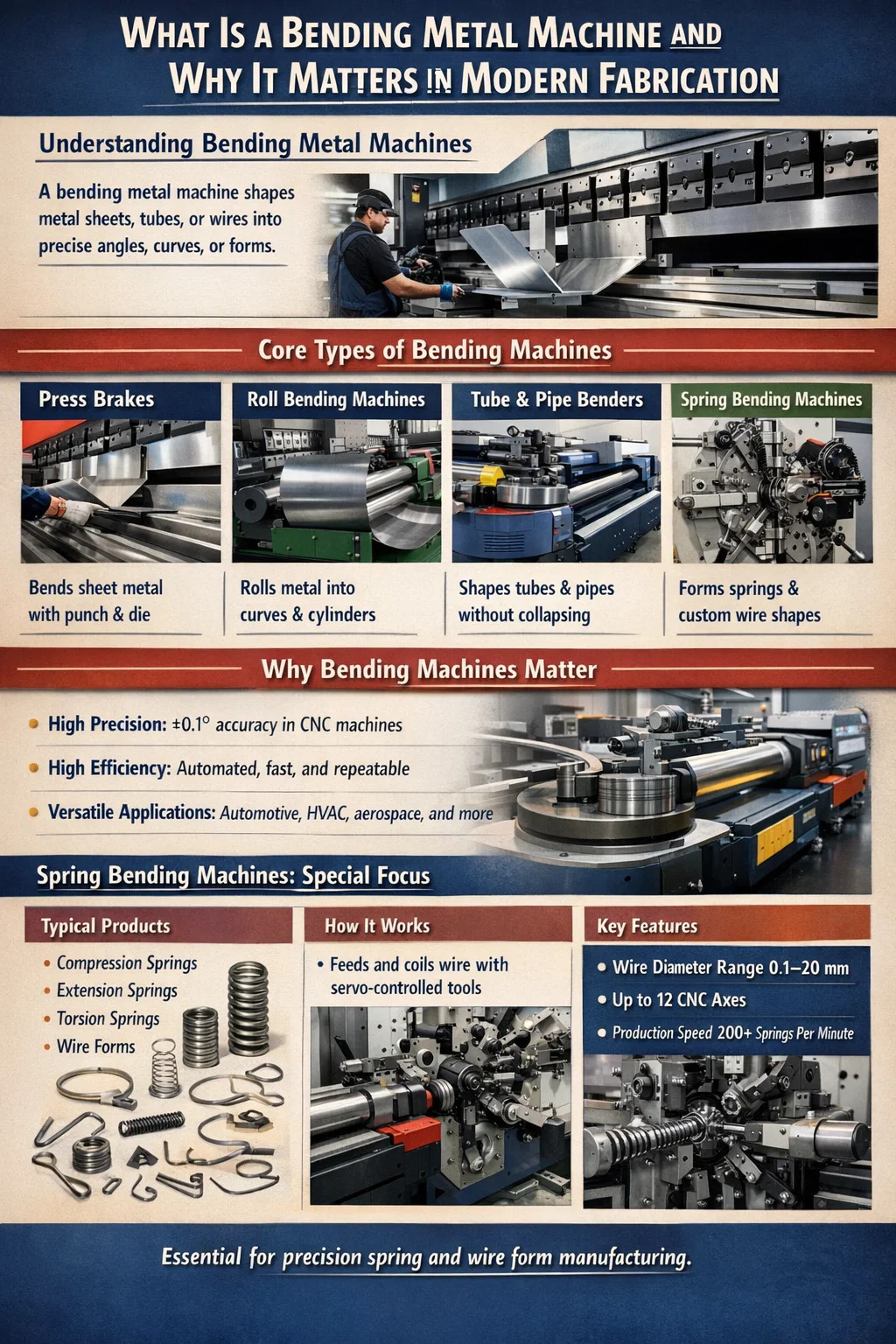 A macchina per piegare molle - denominata anche avvolgitrice per molle, formatrice di molle CNC o macchina per la formatura di fili a seconda della configurazione - è una macchina per la piegatura dei metalli altamente specializzata progettata per trasformare materiali di filo in molle e forme di filo ad alta produttività. Comprenderne il principio di funzionamento aiuta a chiarire perché non può essere semplicemente sostituita da una macchina piegatrice per uso generale.