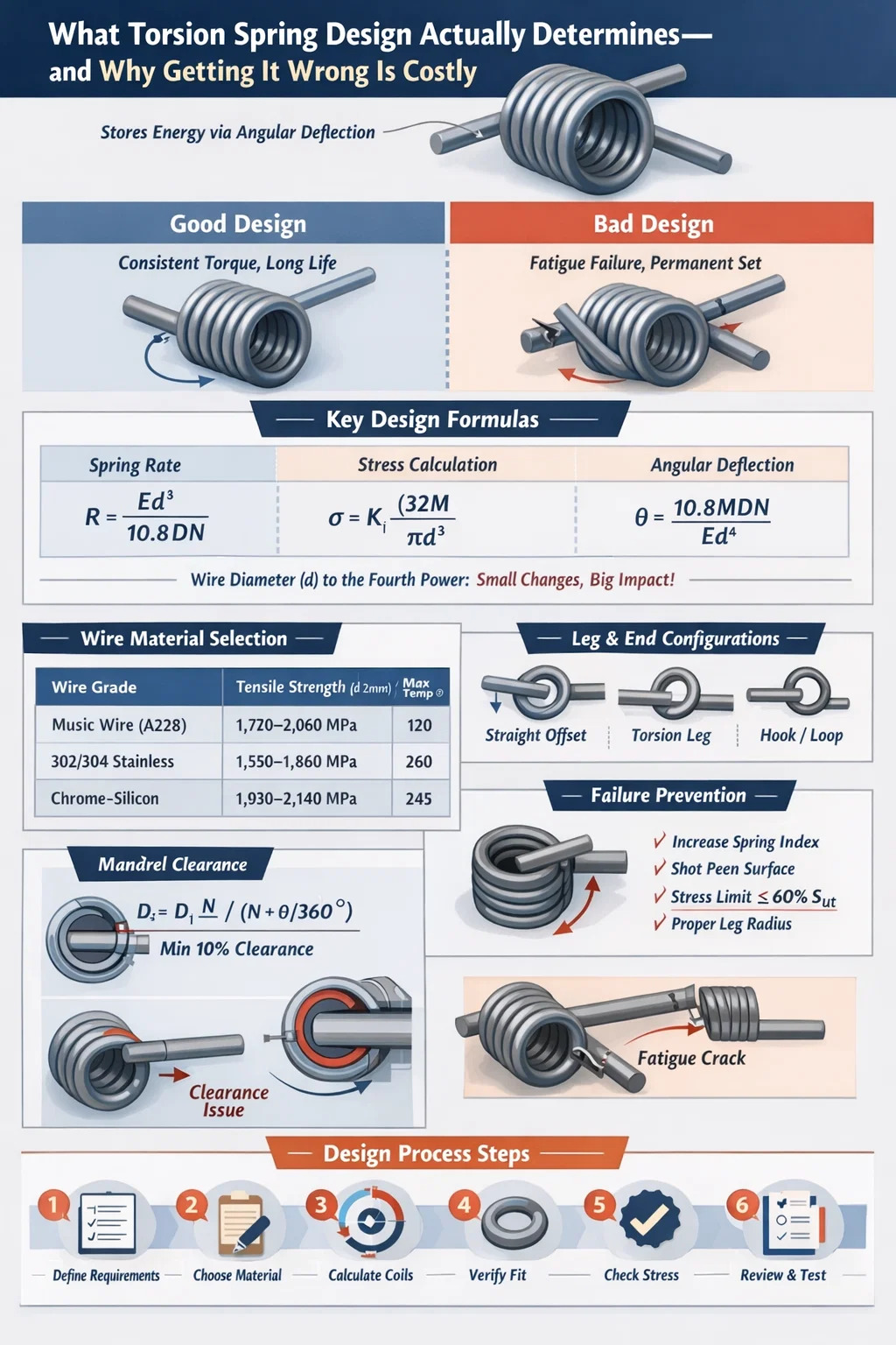 La progettazione della molla di torsione si basa su una serie di equazioni meccaniche consolidate. Comprenderli non è facoltativo: determinano se la molla sopravvive alla sua vita operativa o si guasta nelle prime migliaia di cicli.