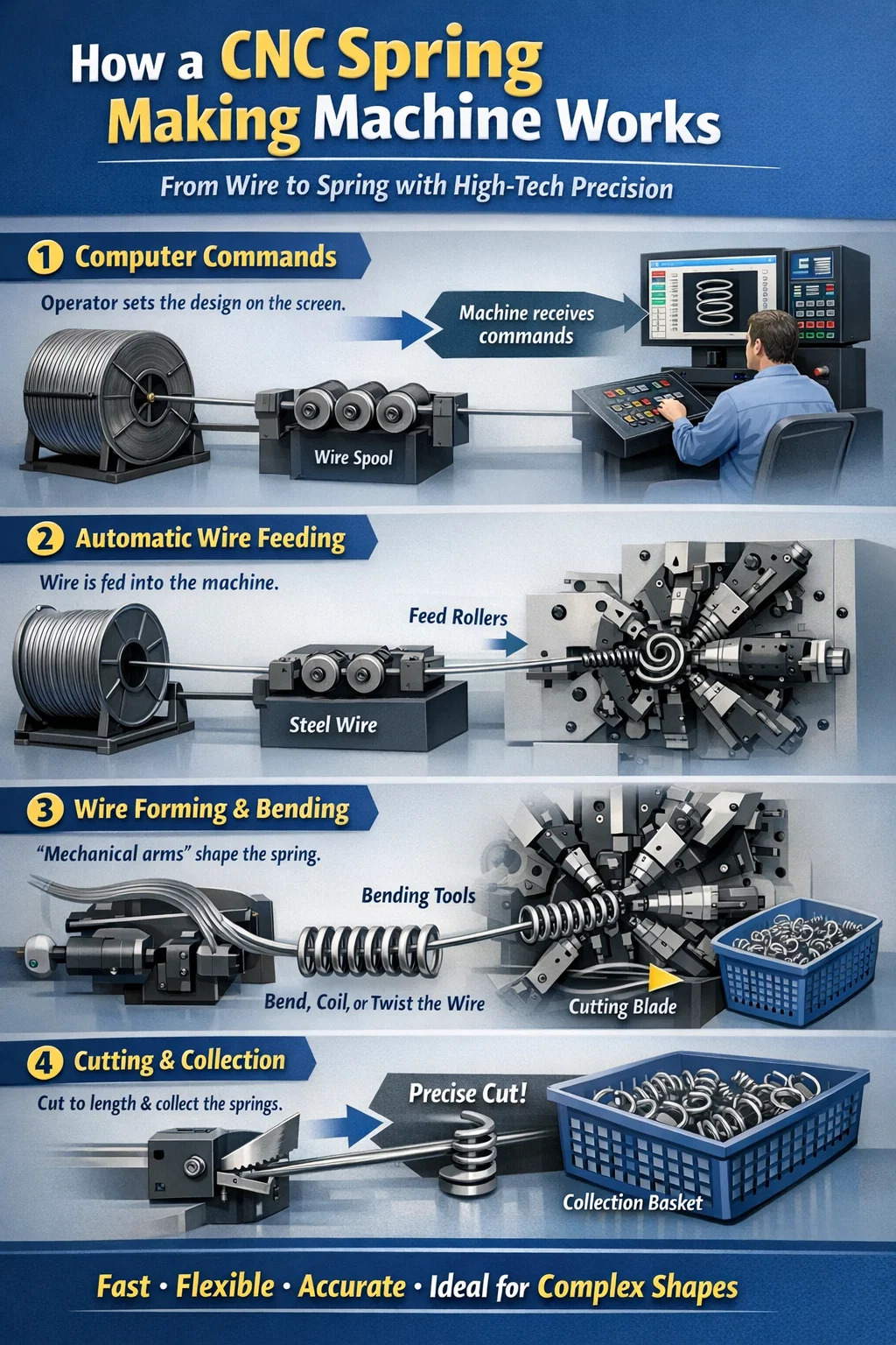 • Il "cervello" del computer impartisce comandi: questo è il nucleo della macchina. L'operatore imposta sullo schermo del computer la dimensione, il numero di giri, la lunghezza e la forma della molla. Il computer converte queste informazioni in comandi, controllando con precisione quando e quanto si muove ciascun motore (solitamente servomotori) all'interno della macchina.