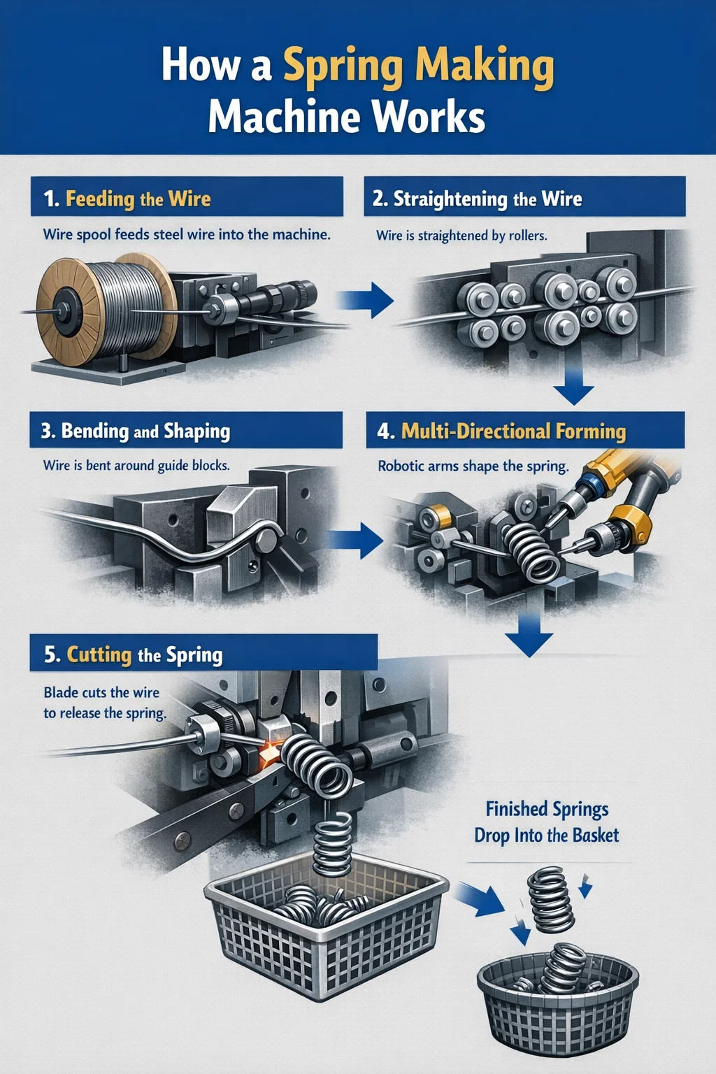 In poche parole, a macchina per la produzione di molle è un'apparecchiatura specializzata che prende bobine di filo metallico diritto e, attraverso potenti piegature, avvolgimenti e tagli precisi, le trasforma nelle molle che vediamo ovunque nella nostra vita quotidiana.