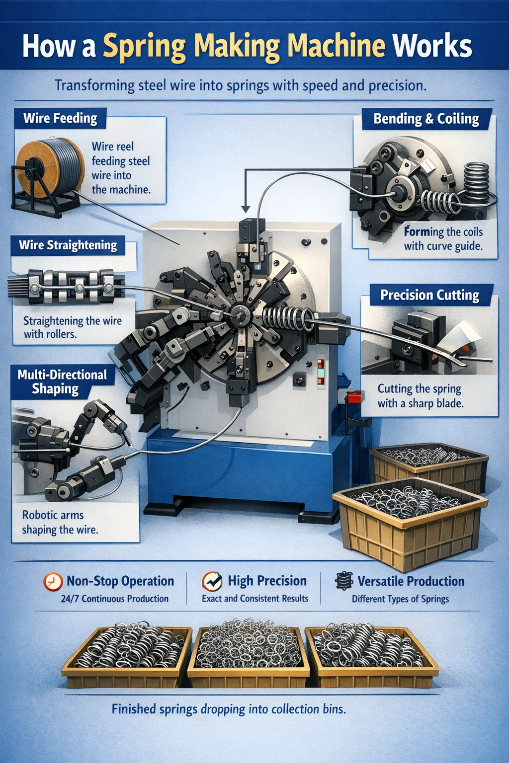 A macchina per la produzione di molle è una macchina automatizzata appositamente progettata per trasformare il filo metallico in varie tipologie di molle.