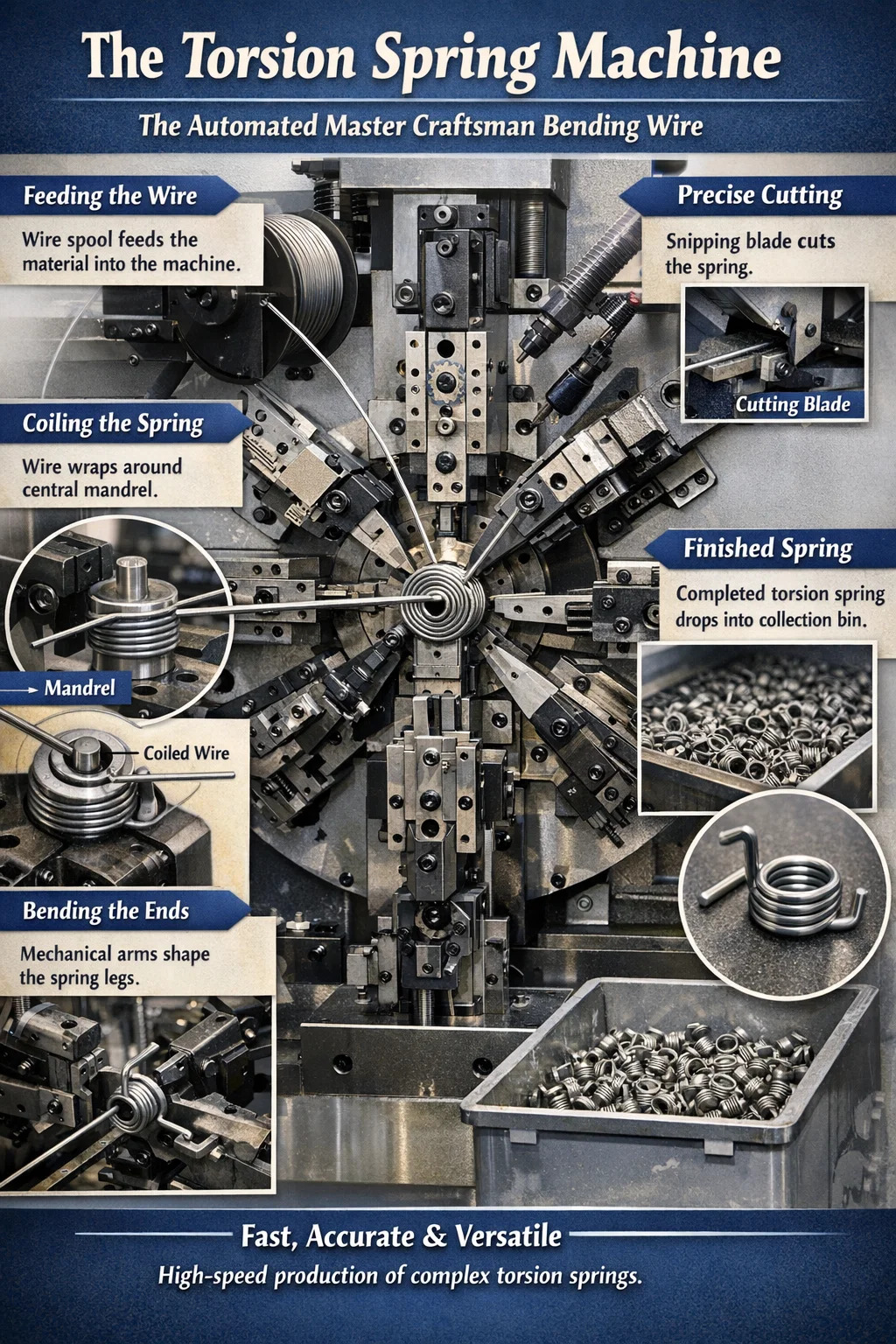 Se hai mai visto una molletta da bucato in legno o il perno di una porta automatica, la molla interna con un centro a spirale e due "gambe" che si estendono da ciascuna estremità è la sua creazione. Le normali macchine a molla potrebbero avvolgere solo semplici cerchi, ma una macchina a molla di torsione può non solo avvolgere il filo ma anche piegare le estremità della molla in vari angoli complessi, permettendole di agganciarsi o supportare altre parti.