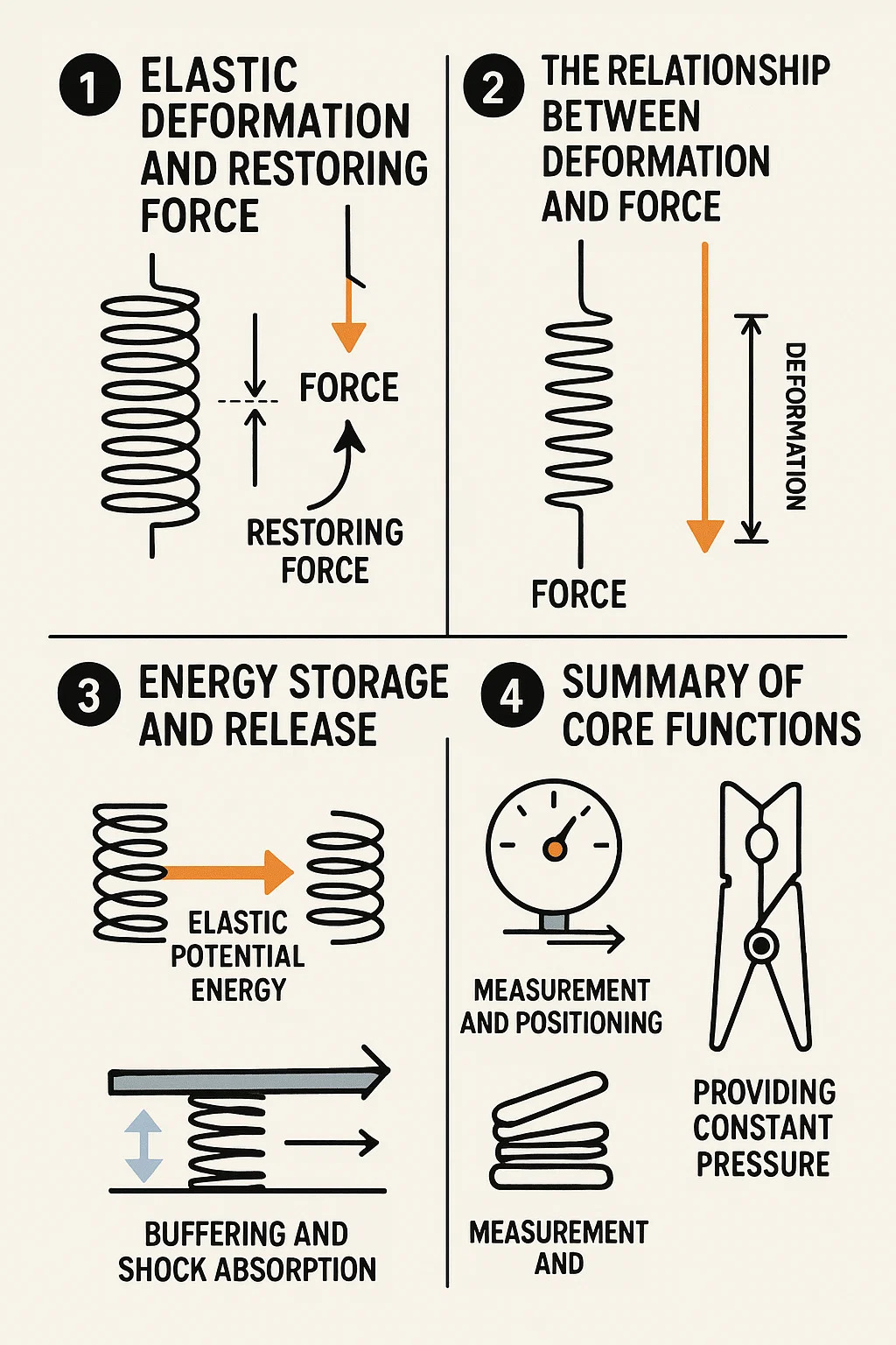 Ammortizzazione e assorbimento degli urti: Le molle hanno la capacità di assorbire l'energia derivante da urti e vibrazioni e di rilasciarla gradualmente nel tempo, proteggendo la struttura (come il sistema di ammortizzazione di un'auto). Misurazione e posizionamento: nelle bilance, la deformazione di una molla può essere utilizzata per misurare il peso; in molti dispositivi meccanici viene utilizzato per riportare le parti nella posizione iniziale al termine del lavoro (come nei pulsanti e negli interruttori).